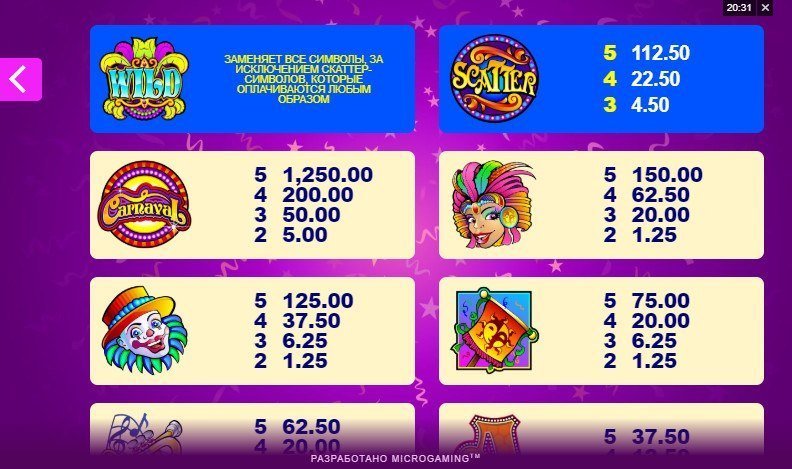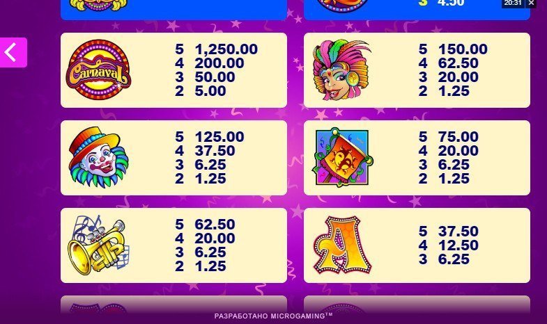 Игра Карнавал не перегружена различными правилами и дополнительными игровыми режимами. Вместо этого здесь можно просто делать ставки и наслаждаться видом того, как на ваш счет поступают деньги.