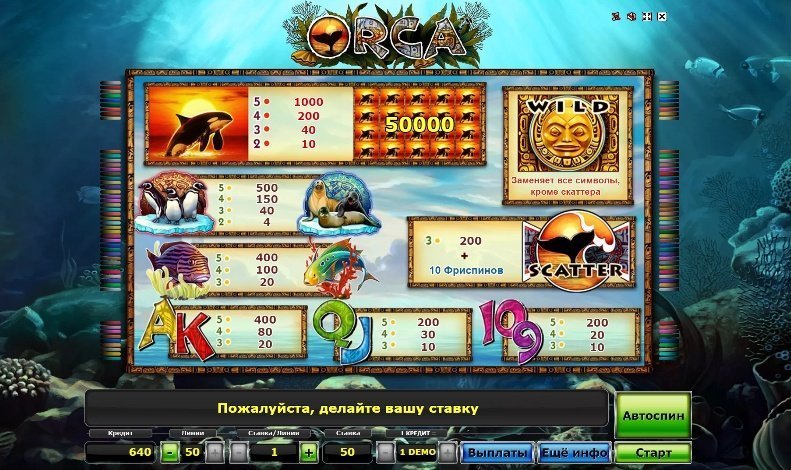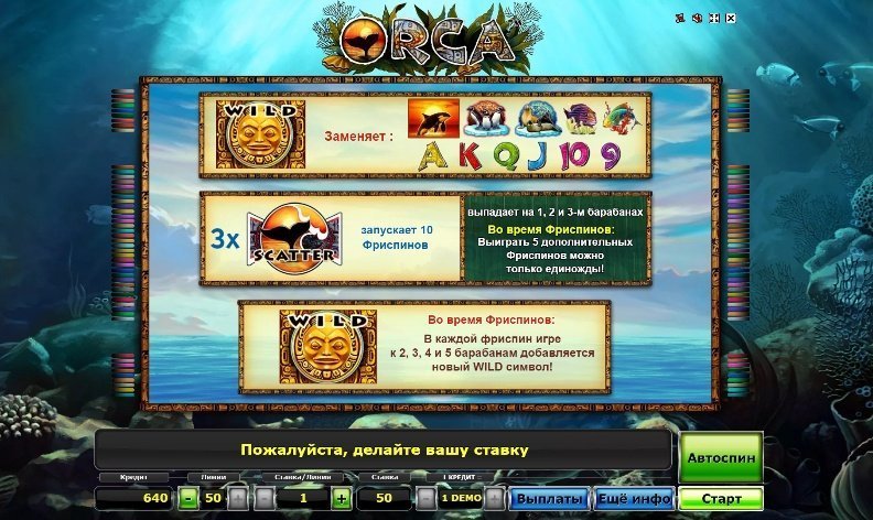 Максимальный выигрыш одного вращения достигает пятидесяти тысяч монет, для его получения необходимо, чтобы символ косатки заполнил собой все барабаны. Слот Orca не зря можно найти почти в любом азартном заведении из нашего рейтинга онлайн казино, ведь в качестве бонуса можно получить десять бесплатных вращений, сопровождающихся выпадением дополнительных диких символов.